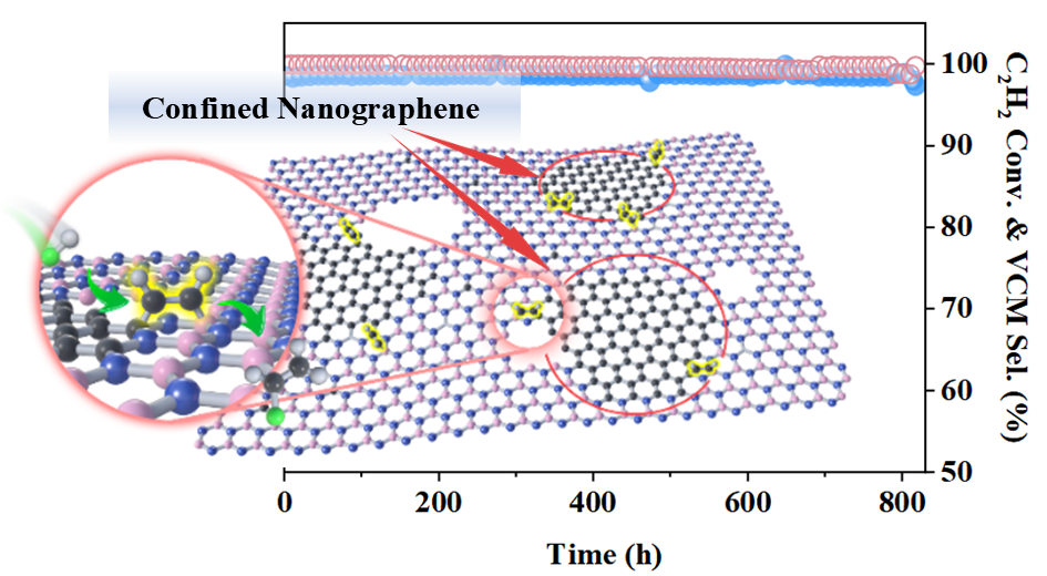 近日(ri),我(wo)所能(néng)源催化轉化全國(guo)重(zhong)點實驗(yàn)室納米與界面催化研究中(zhong)心碳基能(néng)源催化轉化研究組(522組)方(fang)光宗副研究員(yuan)、潘秀蓮研究員(yuan)團(tuán)隊(duì)在(zai)乙炔氫氯化製(zhi)氯乙烯研究領(ling)域(yu)取得新(xin)進(jin)展(zhan),設(shè)計(ji)并製(zhi)備(bei)了(le)一(yi)種氮化硼限(xian)域(yu)納米石墨烯(BNC)非(fei)金屬催化劑,通(tong)過(guo)構建(jian)豐(feng)富(fu)的(de)界面B-N-C活性位點,實現(xian)了(le)乙炔的(de)高(gao)效轉化。
